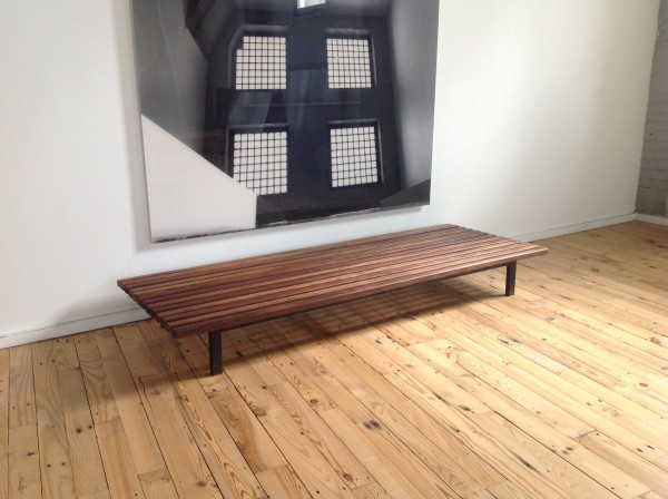 Banquette provenant de la cité Cansado en Mauritanie. De forme rectangulaire, se composant de treize lattes en acajou qui repose sur une structure métallique de section rectangulaire formant le piètement.